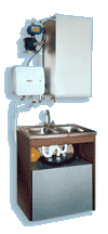 воды. И при этом наше оборудование навесное и занимает очень мало места - всего 0.5 кв. метра. Мы устанавливаем так называемое подстолье, в него монтируем бак для отработанной жидкости, а на стенку вешаем водонагреватель, насосную станцию и бак для приема питьевой воды.